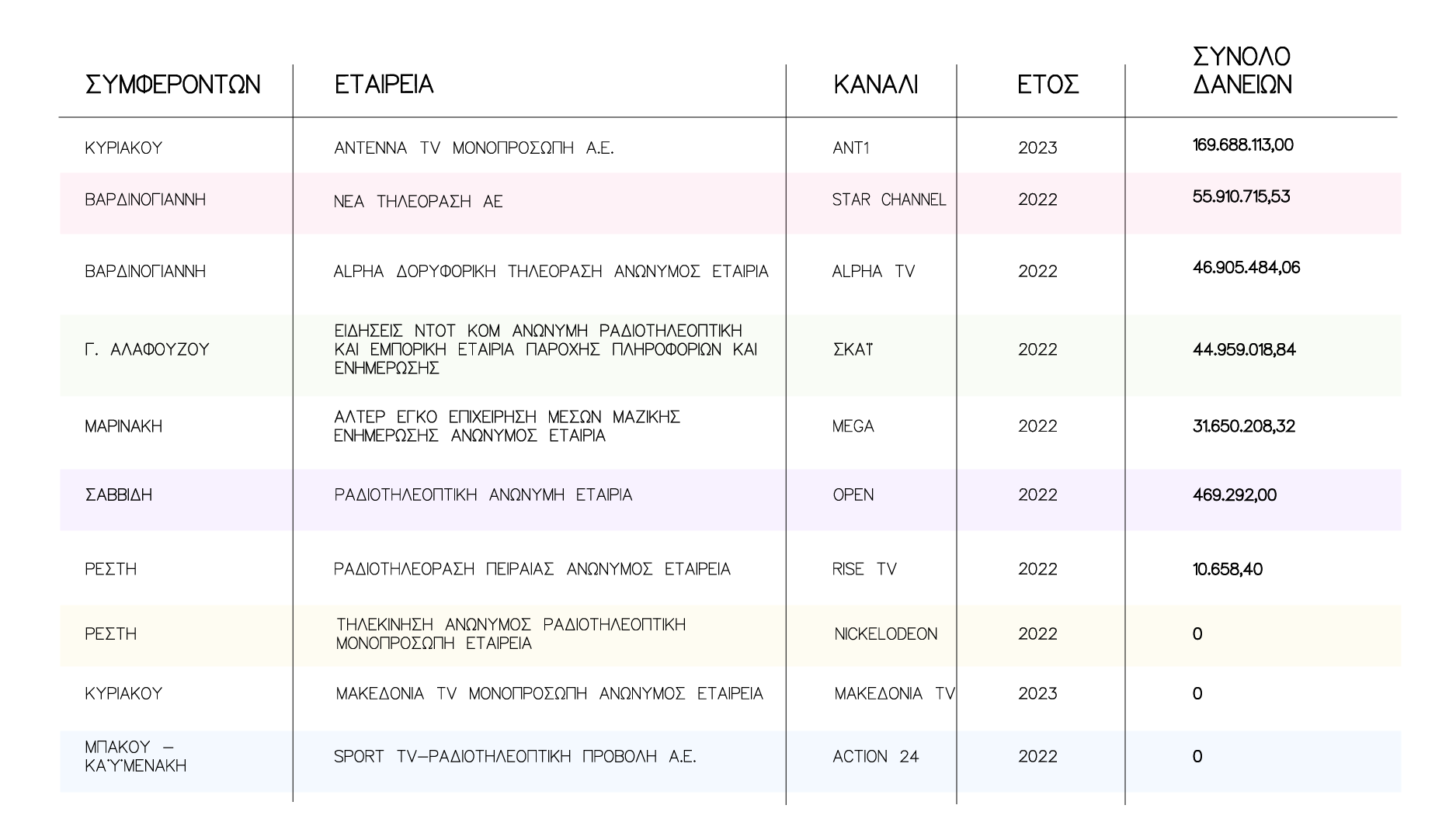 Τον μεγαλύτερο δανεισμό με διαφορά έχει ο ΑΝΤ1 με περίπου 170 εκατ. χρέη, ενώ ακολουθεί η εταιρεία Νέα Τηλεόραση ΑΕ (Star Channel) του ομίλου Βαρδινογιάννη με σχεδόν 56 εκατ. ευρώ χρέη προς τις τράπεζες. Στην τρίτη θέση βρίσκουμε τον Alpha (όπου επίσης συμμετέχει η οικογένεια Βαρδινογιάννη) με τραπεζικές υποχρεώσεις ύψους περίπου 47 εκατ. ευρώ. Έπεται η Ειδήσεις Ντοτ Κομ του Γιάννη Αλαφούζου, (ιδιοκτήτρια εταιρεία του τηλεοπτικού σταθμού ΣΚΑΪ και άλλων μέσων) με τραπεζικές υποχρεώσεις που αγγίζουν τα 45 εκατ. ευρώ και την πεντάδα συμπληρώνει η Αλτερ Έγκο του Βαγγέλη Μαρινάκη στην οποία ανήκει το MEGA Channel (όπως και άλλα ΜΜΕ) με βραχυπρόθεσμες τραπεζικές υποχρεώσεις ύψους 31,7 εκατ. ευρώ.